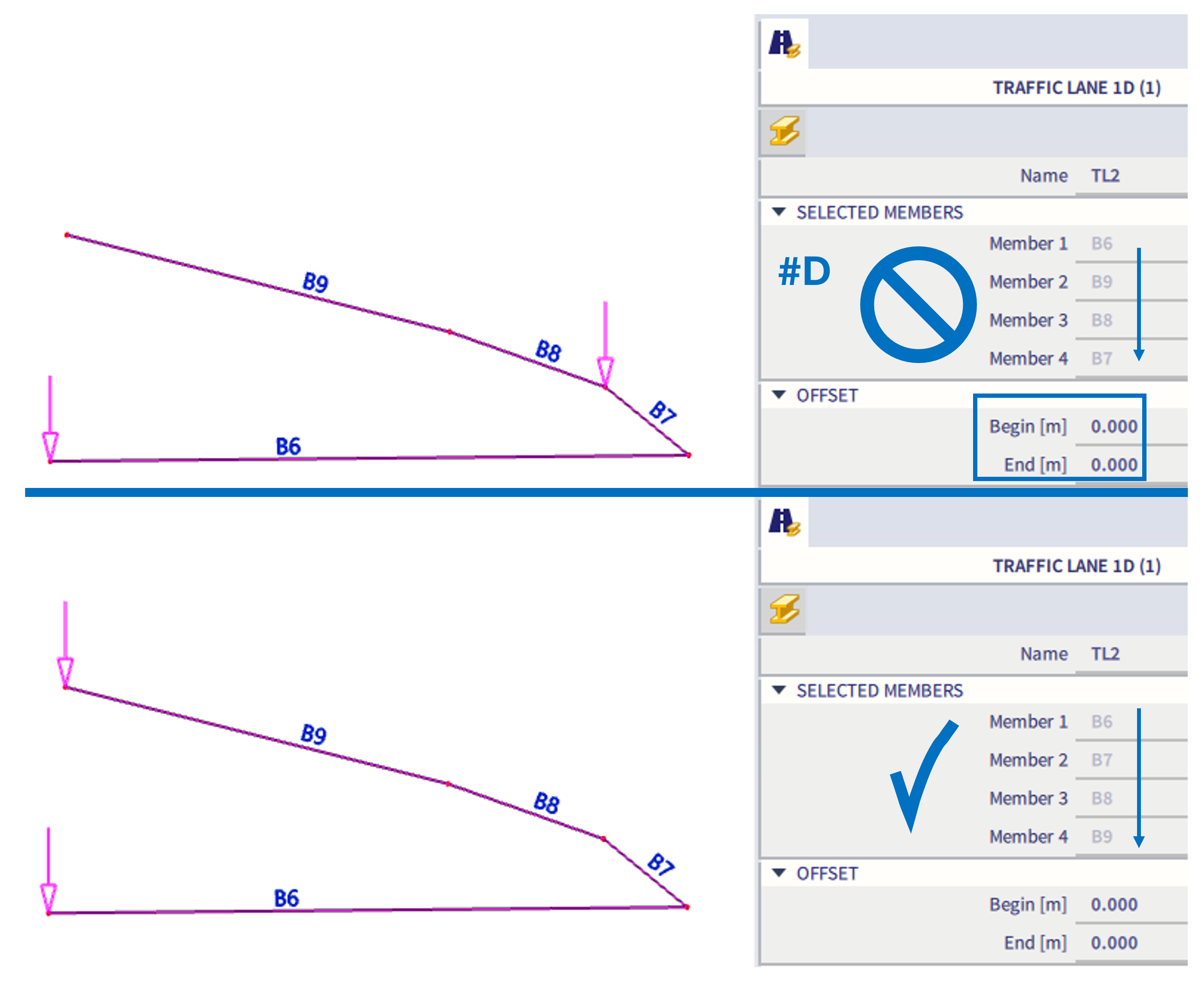 #D - Double check the defined traffic lane is concisely depicted by the begin and end arrow, which determine the begin and the end of the area where mobile load will be applied. Avoid wrong order of the selected beam members.