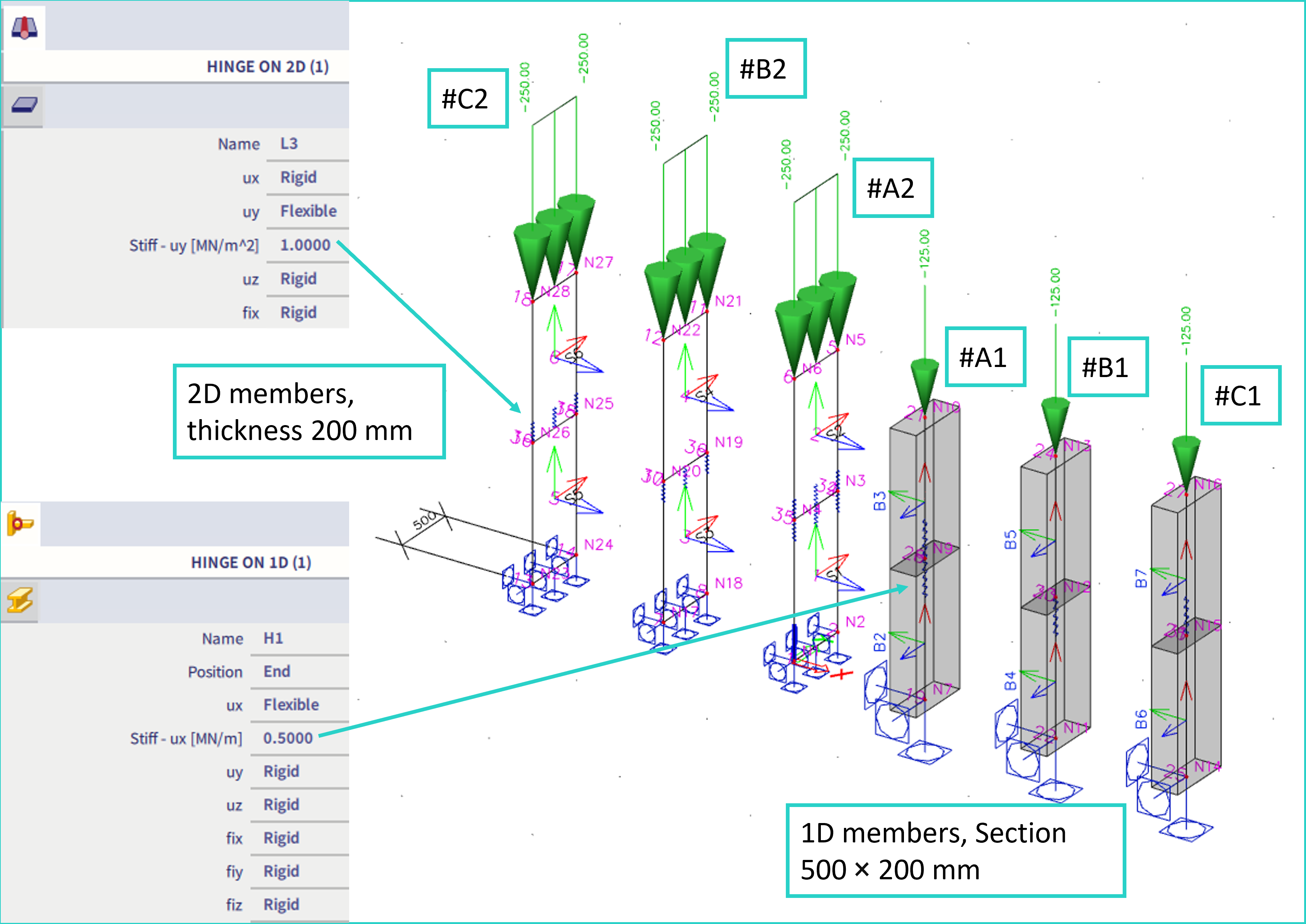 An example is provided using flexible hinge in one direction (translation along the axis of the column). Cases noted as #A1, #B1 and #C1 are 1D members, and cases noted #A2 - #C2 are 2D members (walls in this case). The line hinge stiffness and load of 2D members is set so it corresponds with the load and hinge stiffness applied on 1D members. In the cases #A1 and #A2, the hinge is modelled on both sides of the edge where the hinge is to be considered (this solution is not recommended). In the rest cases (#B, #C), the hinge is always modelled only on one side (what is recommended).
