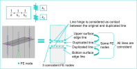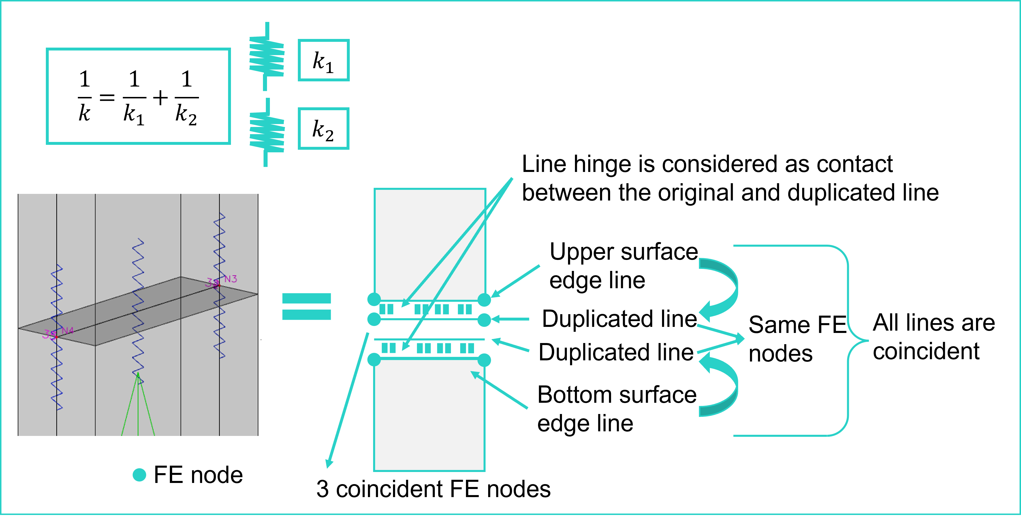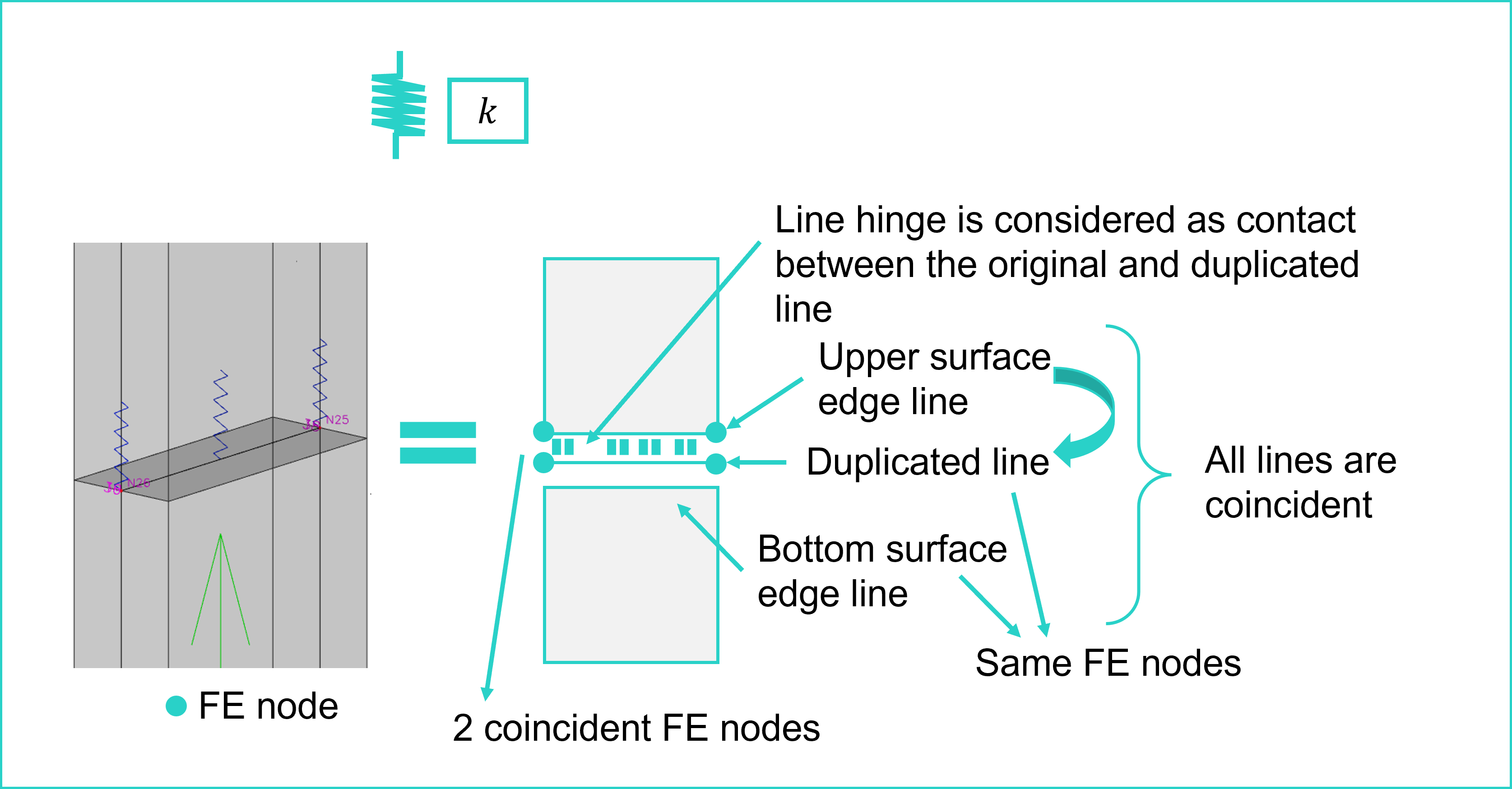 The internal consideration of the hinge for case #C2 is explained in the figure below (case #B2 is practically the same, and #C1 #B1 are for 1D members considered analogically). If the hinge is modelled at the edge of surface, that corresponding line is duplicated, and contact is internally defined between these two lines. All the lines are mutually coincident. The duplicated line contains the same finite element (FE) nodes as the other coincident edge line (which has no line hinge defined). Hence, in this case, along such edge, there are always 2 coincident FE nodes, as shown below: