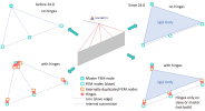 Since version 24.0, the internal connections of these nodes is done in a bit different way (top-right corner) - the connections between nodes are forming the smallest path (represented by the rigid body), what is formally the same as before, but due to the fact "very stiff" beam is not the same as "ideally rigid", and also mathematical formulations of these connections (influenced also by the " FEM - Multi Freedom Constraints (MFC) - Lagrange Multipliers" settings), there might be little differences. In case there are hinges (bottom-right schema), the nodes are again internally duplicated, and constraints between the coincident nodes are handled.
