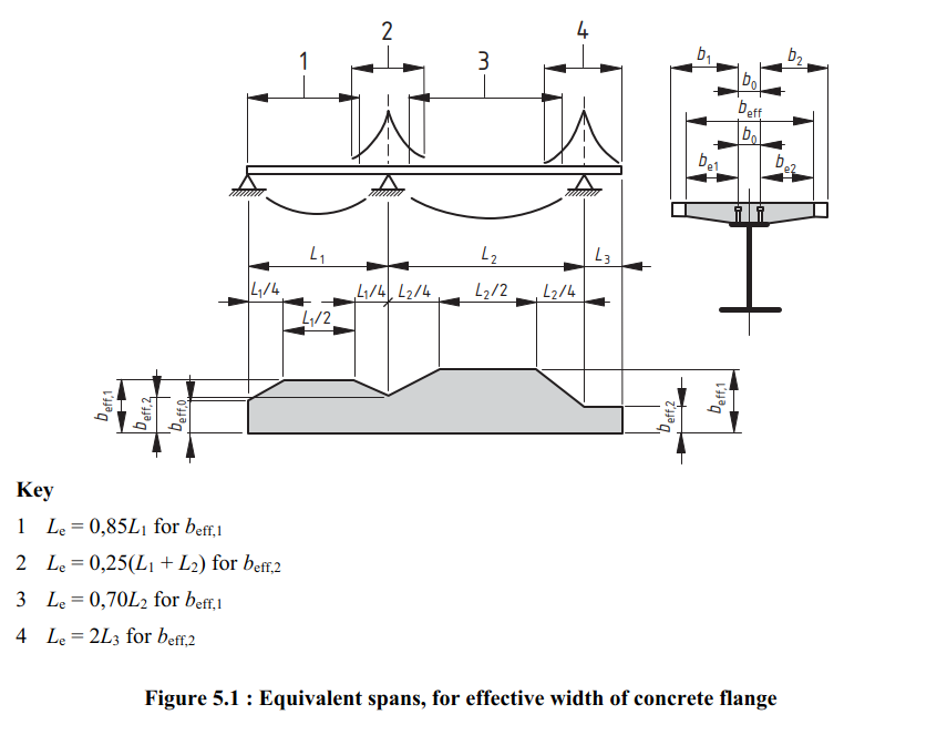 For composite beams, the effective width is calculated according to EN 1994-1-1 clause 5.4.1.2 and 5.4.2.1.