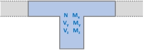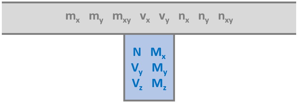 For analysis, the beam is considered as a distinct entity which fully collaborates with the plate. As a result, the analysis produces beam results in the plate rib (internal forces N, Vy, Vz, Mx, My, Mz) and plate results in the plate (internal forces mx, my, mxy, vx, vy, nx, ny, nxy).