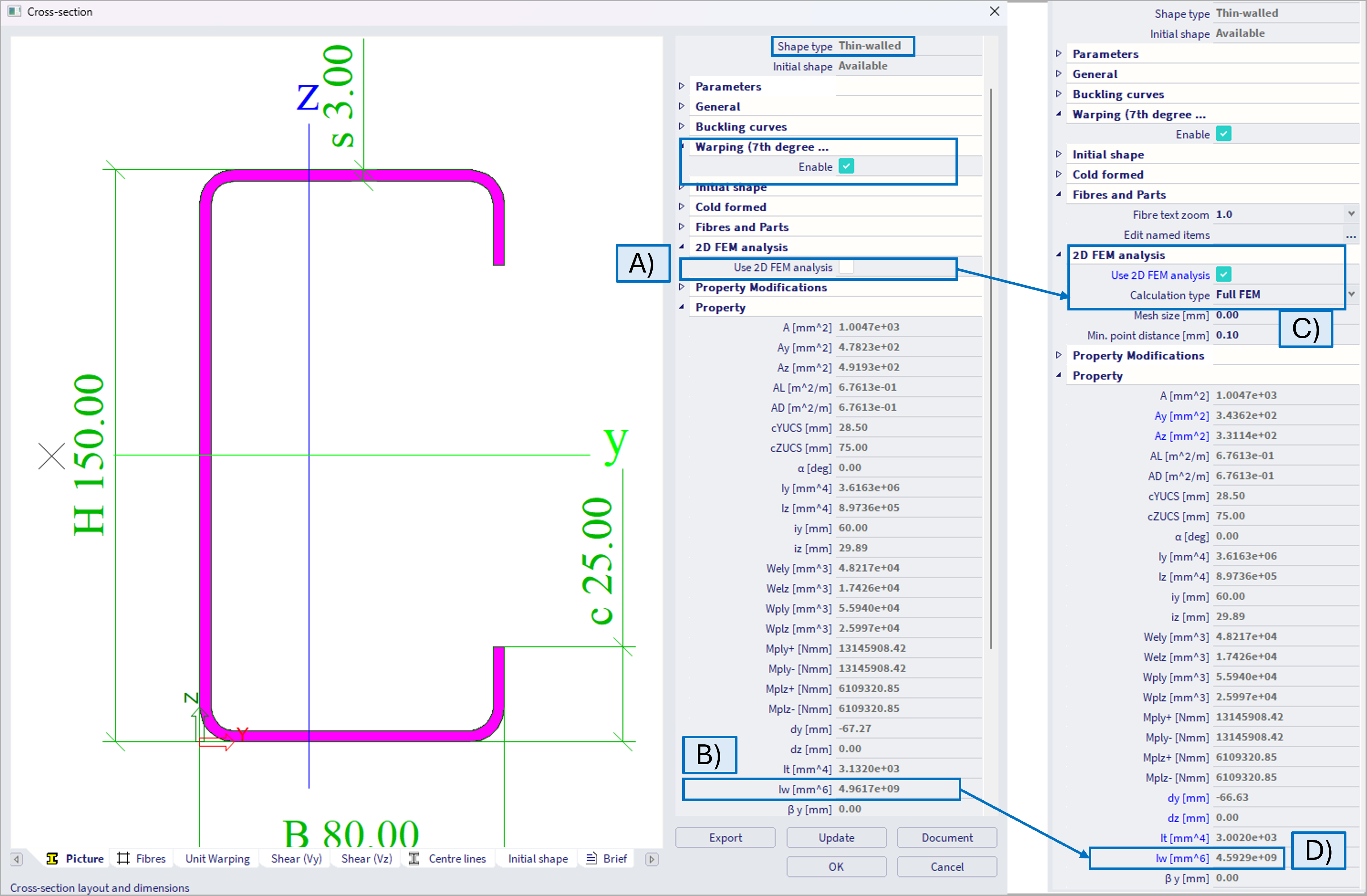 It is necessary to enable the Warping, but "2D FEM analysis" along with "Full FEM" method does not have to be activated (figure below - A), as the warping constant Iw is available (figure below - B). When the 2D FEM method to evaluate cross-sectional properties is selected (figure below - C), with Full FEM method which is recommended rather than Grashof-Jouravski method, the value of the warping constant might be slightly different (figure below - D). The difference is caused by a different approach of cross-sectional properties evaluation, and usually is not expected to be significant. In general, for thin-walled cross sections, where the cross-sectional properties are well tabulated and known, it is not necessary to consider 2D FEM method, which might in general longer the calculation.