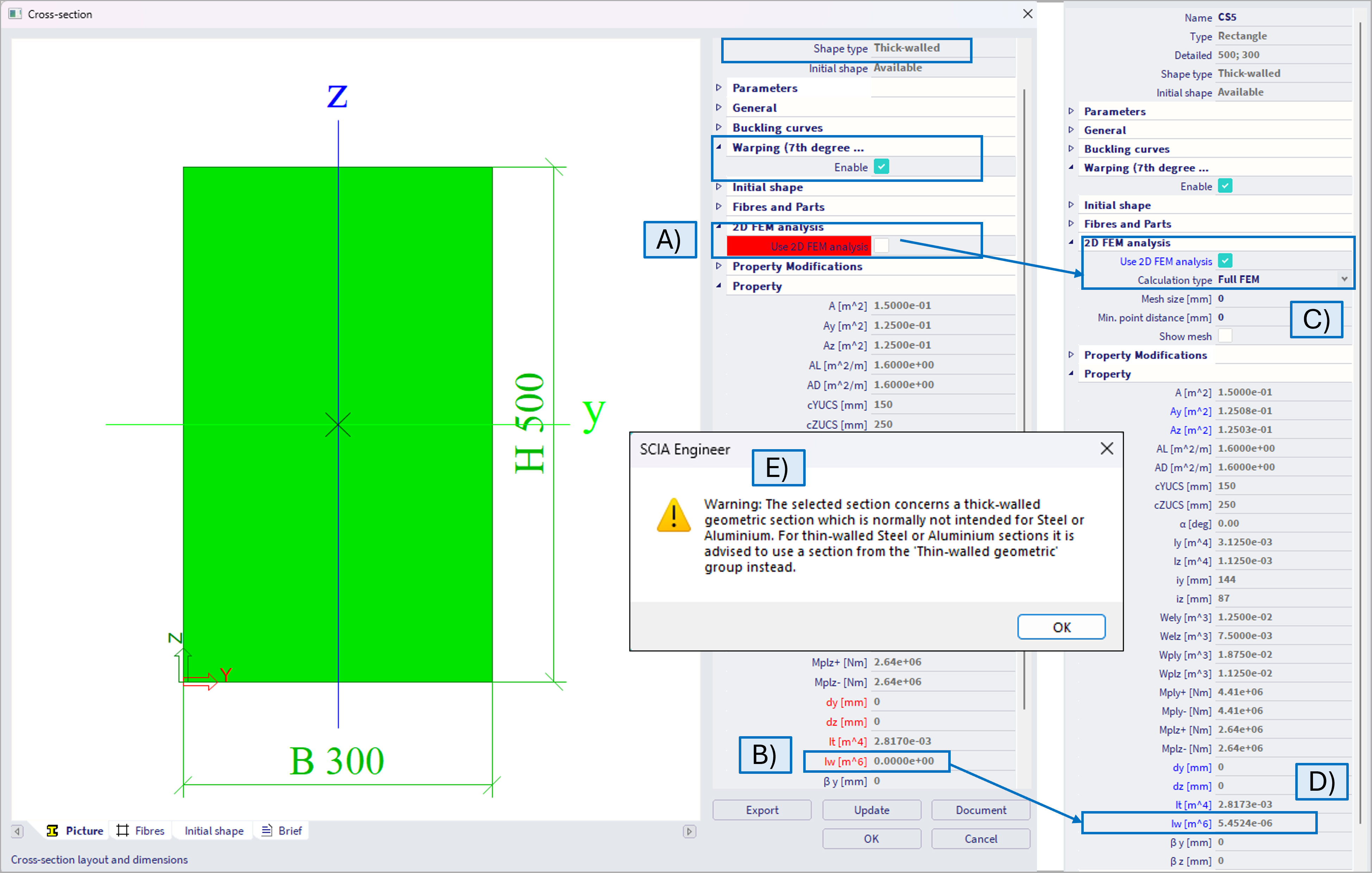 For thick-walled cross-sections, or in general cross-sections, where the warping constant Iw is highlighted by red color and equal to 0 when the 2D FEM method is not used (see figure below - A,B), it is necessary to consider 2D FEM method, ideally along with Full FEM method in order to consider the warping (figure below - C,D). In this case, the warping constant will not be 0 (unless valid 0 values for e.g circular sections, where warping does not occur). In case thick walled are used with steel material, there will be informative warning (E), as in general this is not typical use case, as in case of e.g. wood.