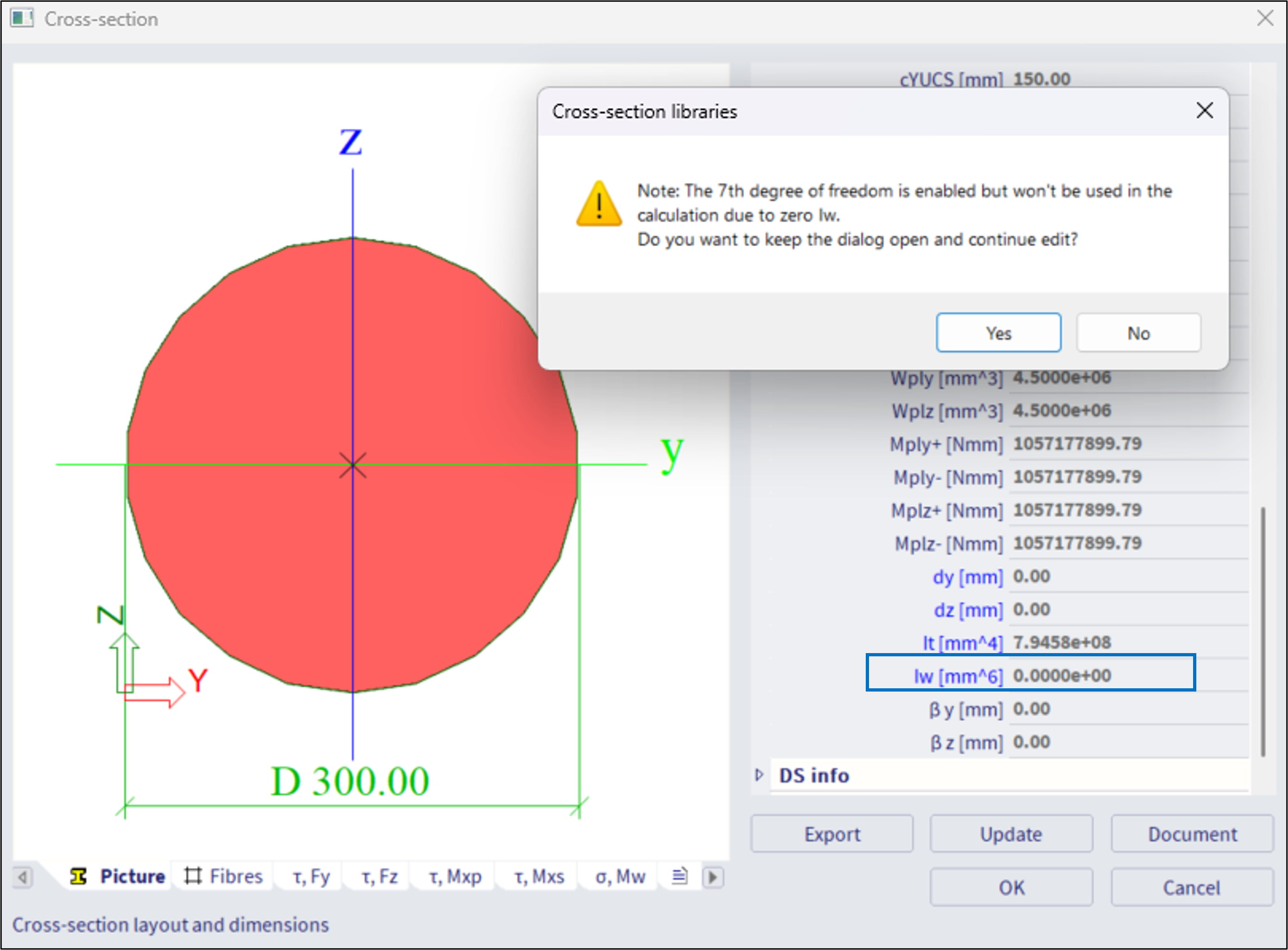 In general, the 7th DoF might be considered for any type of cross-section (of any material), also thick-walled sections, e.g. rectangular cross-section, etc. For some sections like CHS, or full circular sections (see figure below), where the warping constant I_w is exactly 0.0 m^6,, there will be a warning informing the user that 7DoF will not be used for these sections, if the warping is activated for such sections. The user will encounter such warning while closing the "cross section" dialogue.