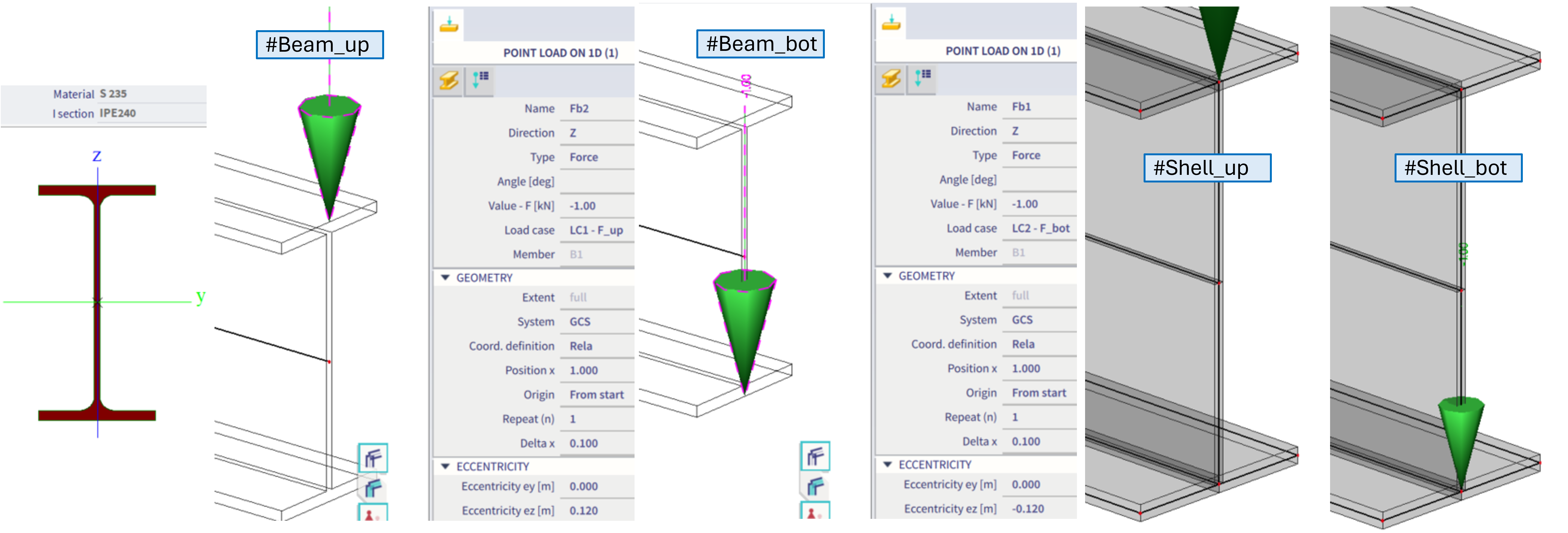 Example of a cantilever IPE240 profile, loaded by a 1kN force at the free end. The ez eccentricity is modified, so once the force is applied on the upper flange, and the other time at the bottom flange, hence introducing destabilizing and stabilizing effects respectively. Beam and shell models are compared below: