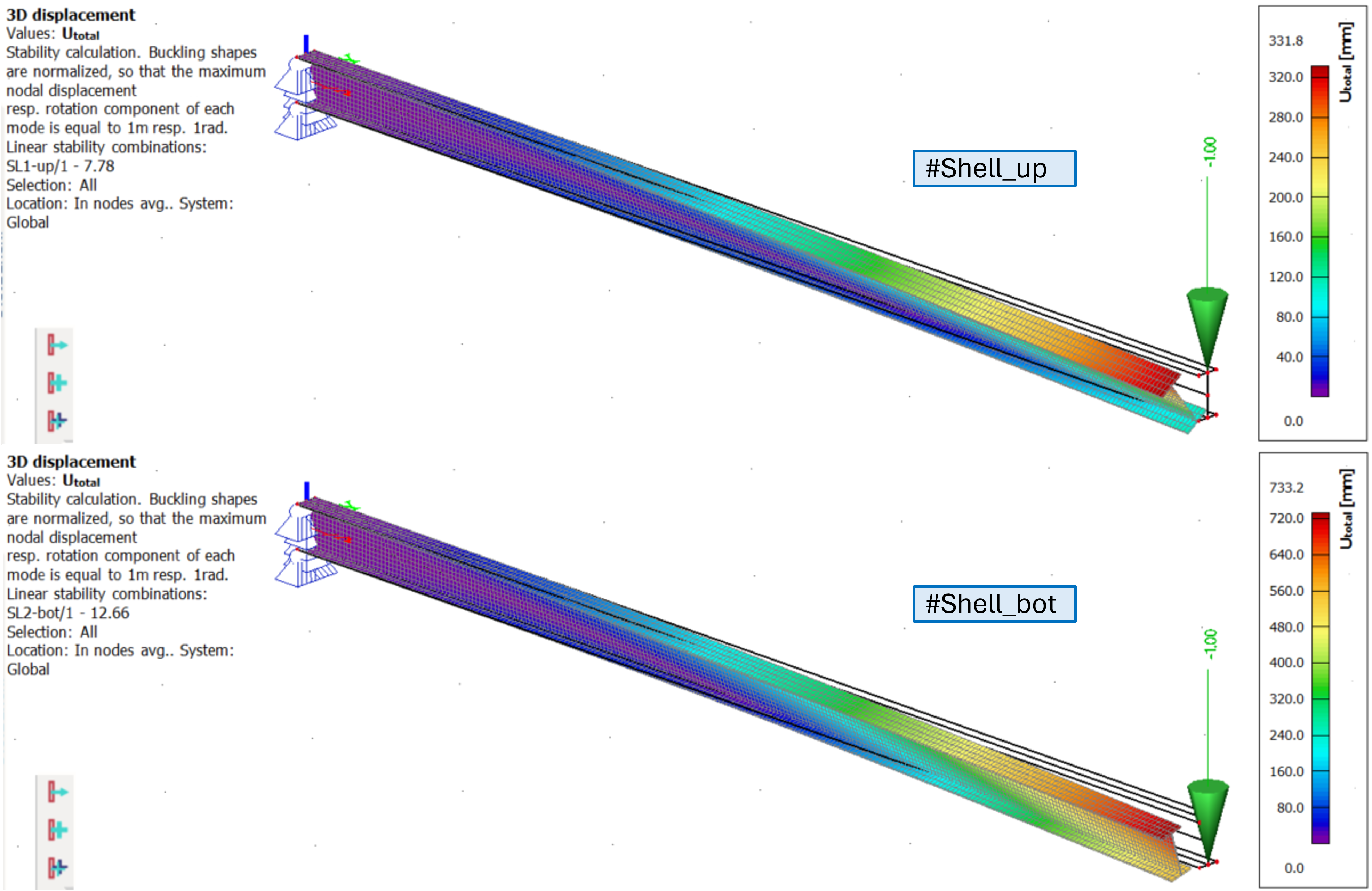 It can be observed the critical coefficient in #Shell_up is smaller then in #Shell_bot. The values itself are slightly different from the beam model, mainly due to little difference in IPE240 section geometry (shell model neglects the extra rounded areas where flanges are connected to the web, hence, hence there is a bit larger cross-section area for the beam model)