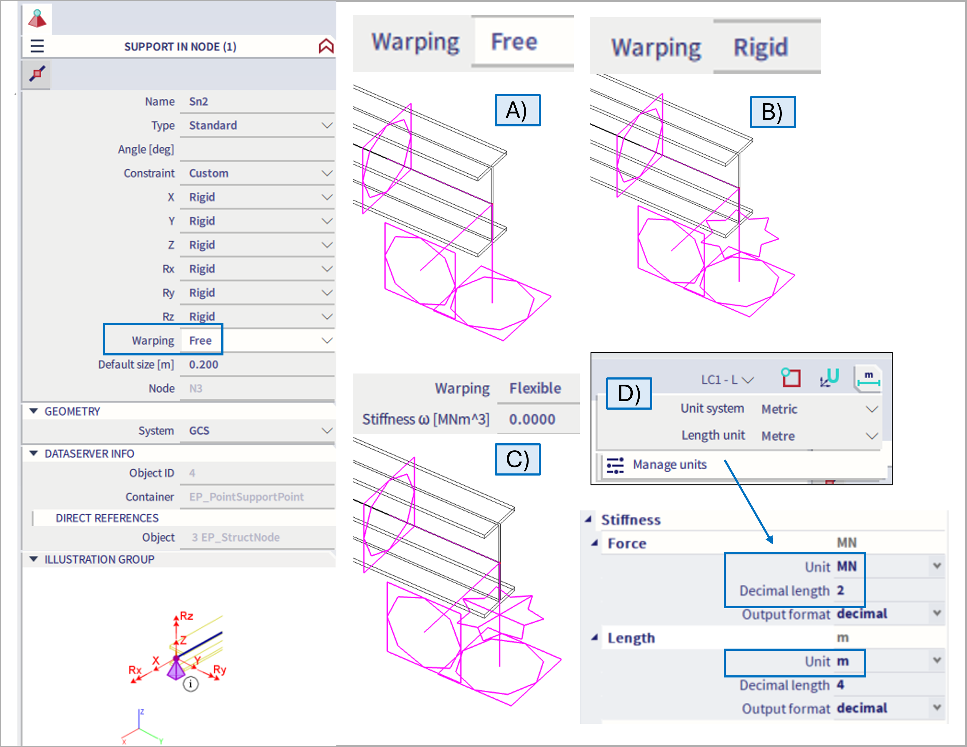 If this option is selected, flexible warping constraint is considered in this support. Subsequently additional stiffness parameter for this support is to be defined: "Stiffness ω", with default value = 0.0 (hence referring to "Free" state of warping constraint). The unit of this stiffness is determined based on selected "Force" and "Length" units from the "Stiffness" chapter of the unit settings dialogue (part D in the figure above), and the dimension is "Force * Length ^3".