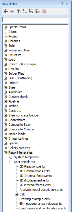 Report templates can be used for creating of new reports (In the Engineering Report manager. Or it is possible to insert them into existing report from the list of available templates in the New items panel. It is possible to insert more templates into one report.
