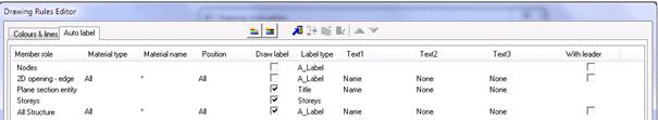 The definition part of rules for Autolabels is similar to the drawing rules for lines. In the specification part the user can select a label type from the existing label types stored in the Label type manager (see separate chapter). Then automatic texts are available (according to the Member role). Those texts are then used as text values of labels during their regeneration.