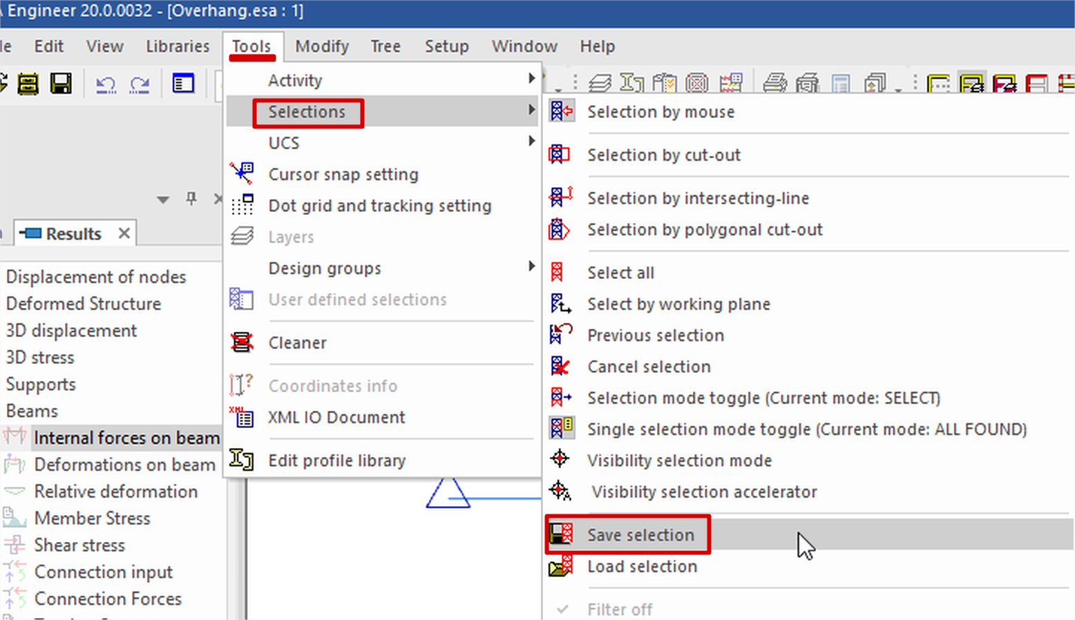 It is possible to define type of selection of model members in 3D window. There are five possibilities: