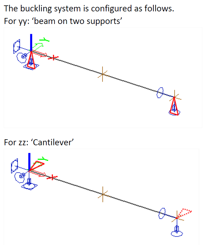 The buckling system is configured as follows.For yy: ‘beam on two supports’; For zz: ‘Cantilever’