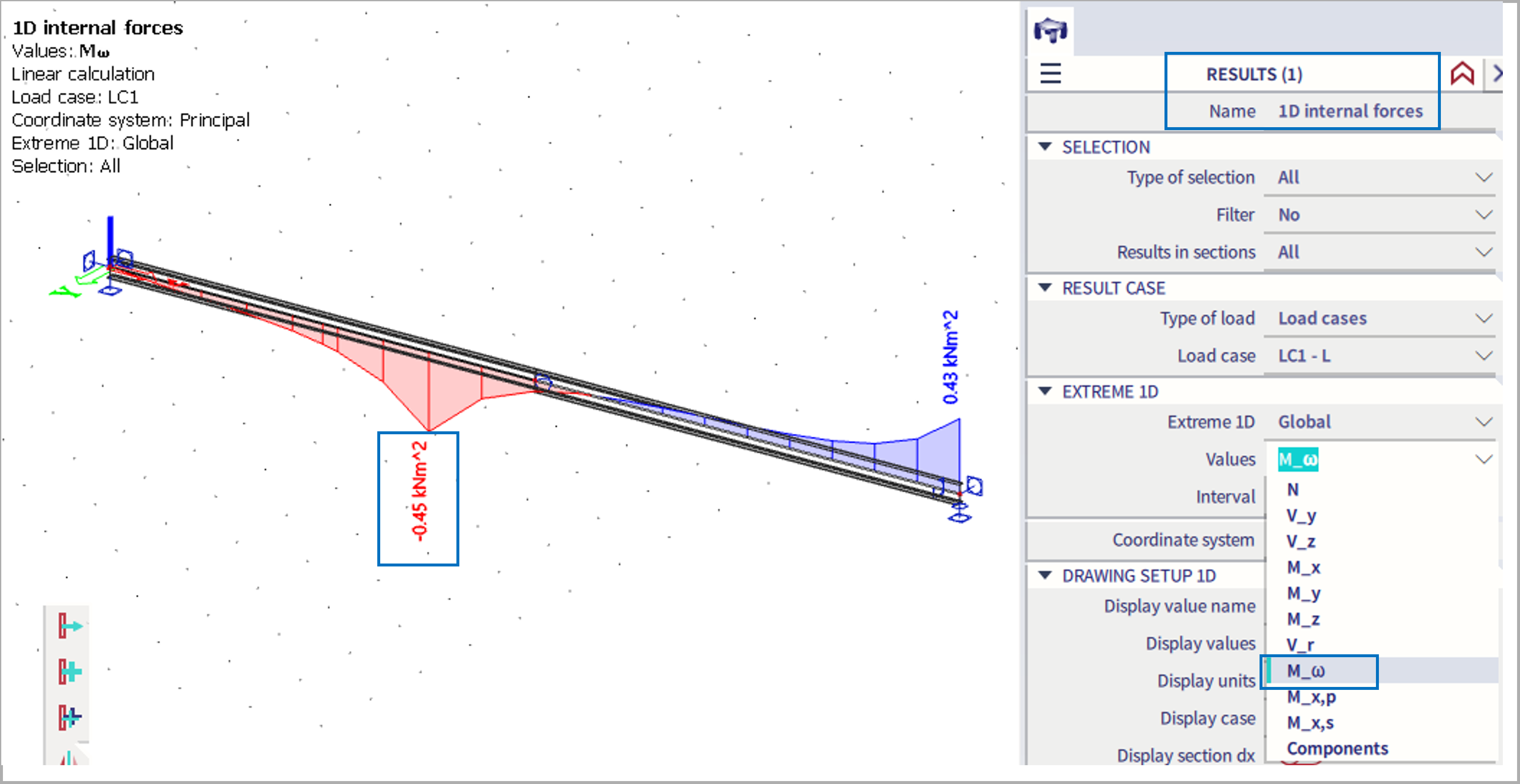 There is a new 1D internal force result in case warping is activated in the project: warping bimoment, M_w. It has an unit force * length^2, as it represents two bending moments on an arm.