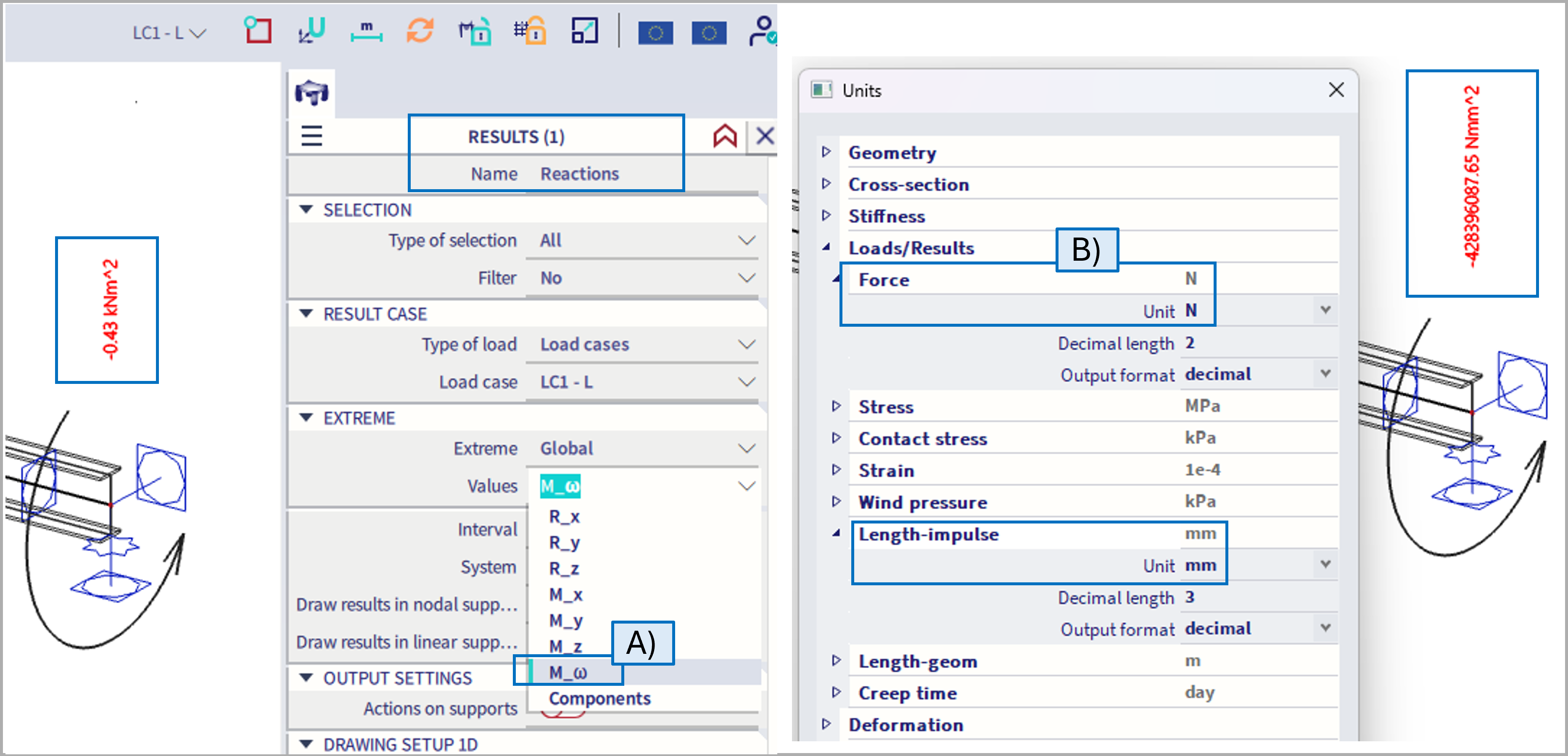 The unit for this bimoment might be modified by altering the unit for "Force" and "Length-impulse" within the "Loads/Results" if the "Unit" settings dialogue - see figure below, B).