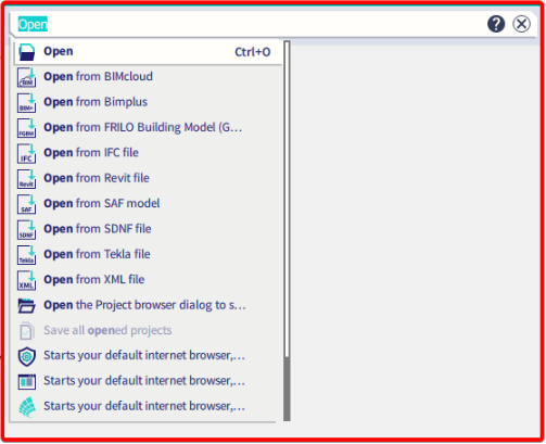 Most commands are available only in an open project. If there is not any project opened then the SCIA Spotlight can only be used for some Open commands.