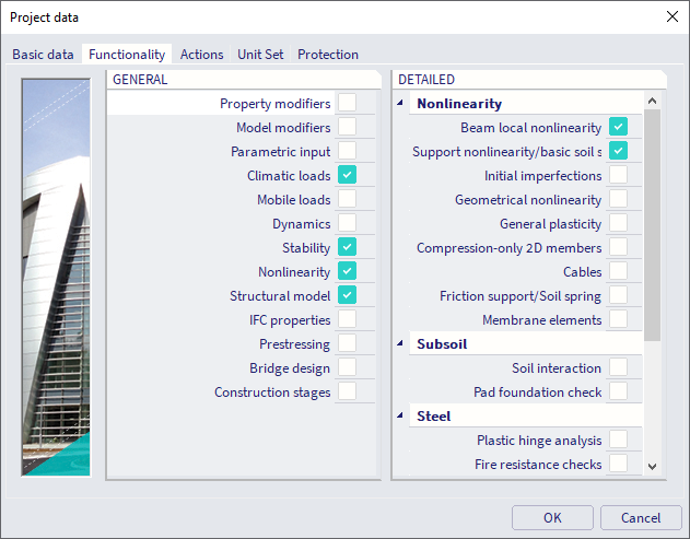 SCIA Engineer offers a wide range of capabilities. In order to make the operation of the program as clear and simple as possible, the project settings allow for selection of those features that are needed and required.